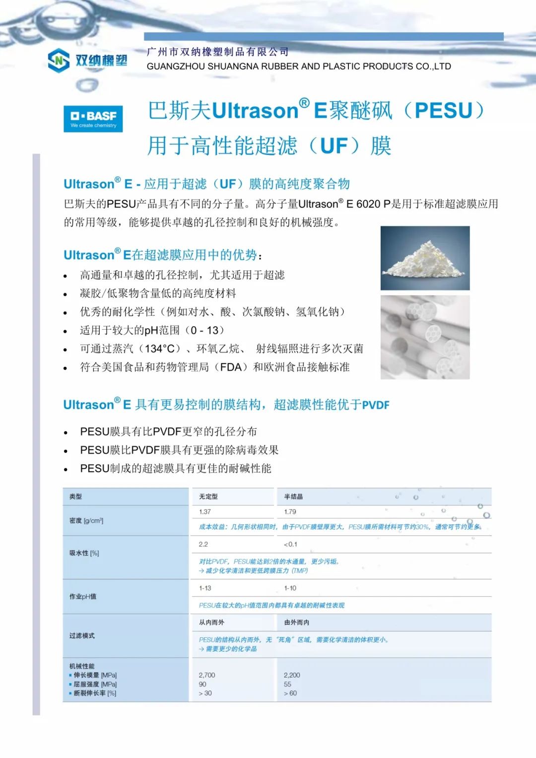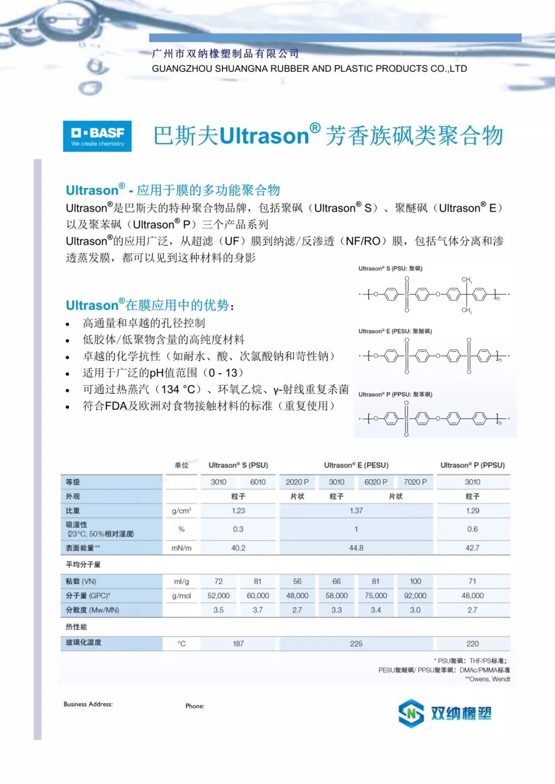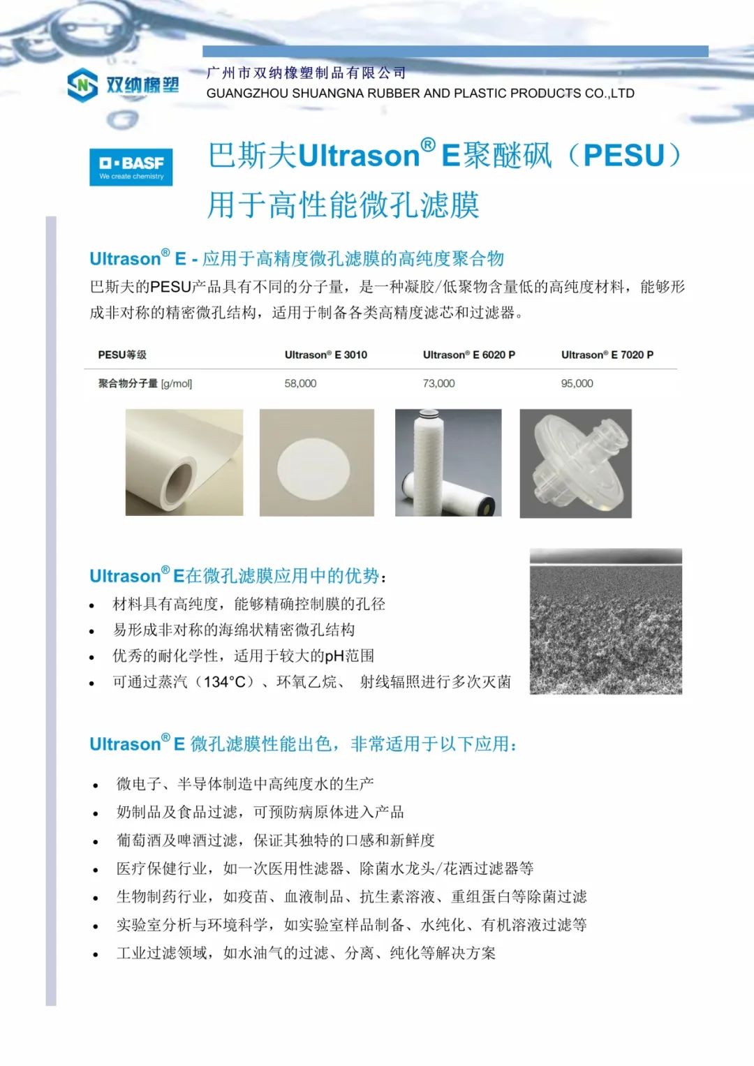 Guangzhou Shuangna Rubber & Plastic Products Co., Ltd. was established in 2015, is the German BASF high temperature material Ultrason®(including polysulfone PSU, polyethersulfone PESU, polysulfone PPSU) distributor in China, the office address is in Guangzhou Tianhe District City Center, has its own warehouse in Guangzhou and Shanghai. The company has always followed the "customer first, quality first, service-oriented" business philosophy, in-depth customer application market, long-term cooperation with customers, after years of solid operation, has a professional technical sales team. The company team has many years of hard work and service experience in ultrafiltration and nanofiltration/reverse osmosis membrane applications, has been recognized and praised by customers with excellent service quality, and has established strategic partnerships with a number of industry leaders, and has grown into BASF's largest specialty materials distributor in the world.