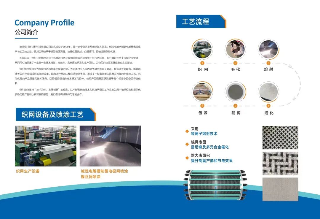 德清恒川新材料科技有限公司(简称“恒川科技")成立于2016年,位于浙江省德清县,是一家专业从事热喷涂技术开发、碱性电解水制氢电解槽电极生产与加工的企业。