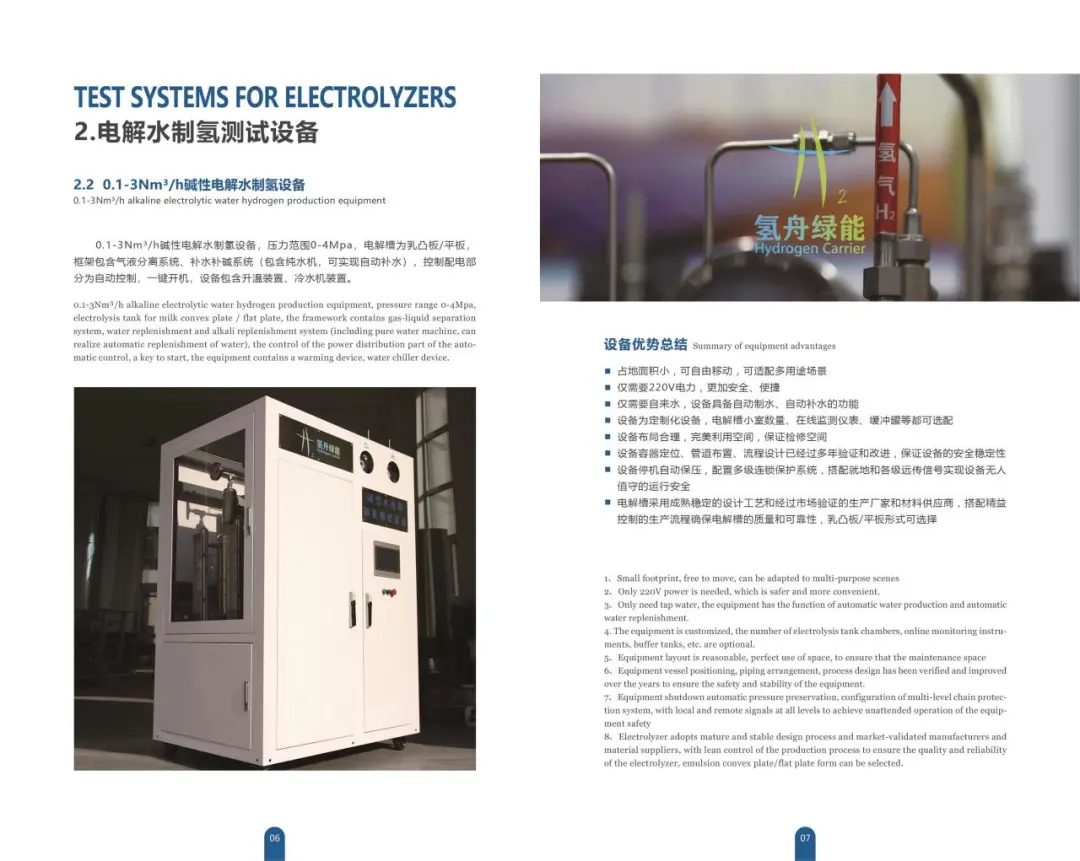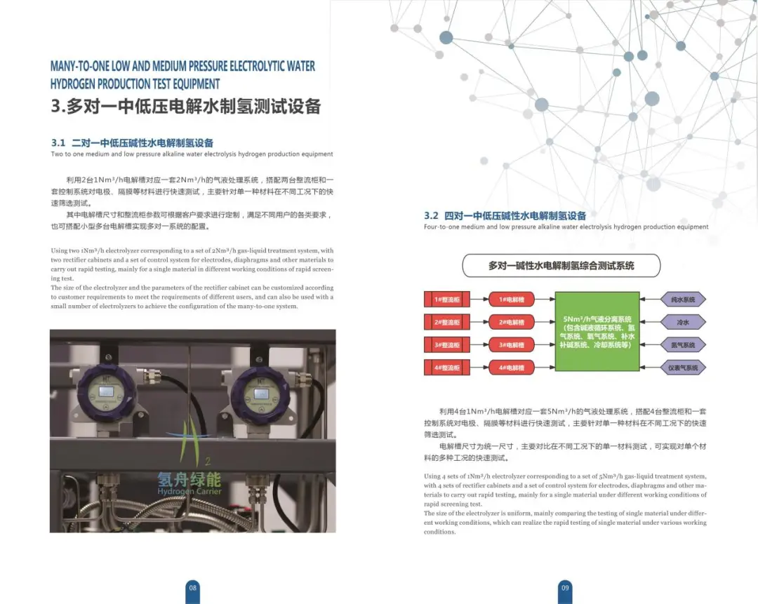 氢舟绿能具有完善的电解水制氢设备测试实验室;成熟的碱性(0.1--10Nm³/h)制氢测试产品及10-200Nm³/h风光氢储耦合系统产品。