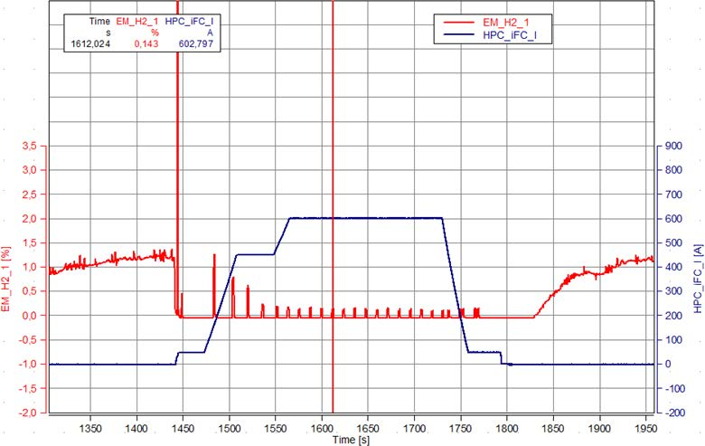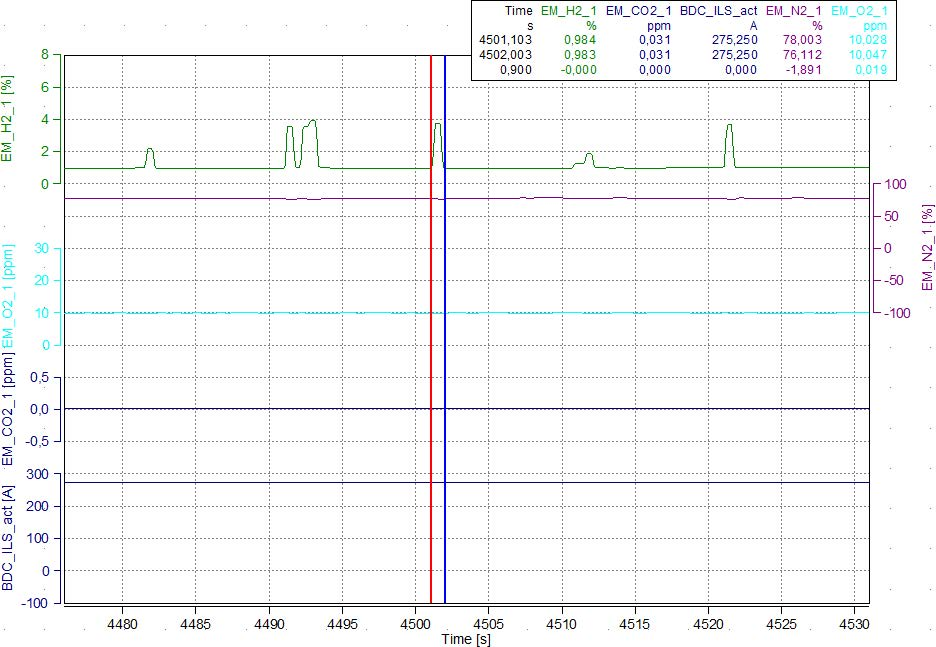 氢内燃机是将氢气作为发动机的燃料直接进行燃烧。而氢气相比汽油、丙烷和天然气等其他燃料,更易发生泄漏,同时也具有更大的浮力(快速上升)和更大的扩散性(横向移动),因此需要实时监测H2浓度。Hydrogen Matrix H7已经在国内知名车企应用于氢内燃机领域的相关测试研究,能够充分满足用户对于对高度动态的H2和He测量分析的需求。以下是一些实测数据示例。