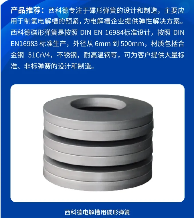 西科德成立于2014年,从事碟形弹簧行业20余年,公司拥有技术研发10余人,生产团队50余人,专注于碟形弹簧的设计制造销售,材质涵盖弹簧钢,不锈钢,高温合金钢等等;西科德备有大量标准规格库存现货,同时更加擅长非标规格的设计与制造。西科德碟簧主要应用于阀门,船舶,核电,风电,紧固件,汽车,电力,石油各种需要减振预紧的设备以及配件中。拥有大量制氢电解槽碟簧生产经验以及现货库存。