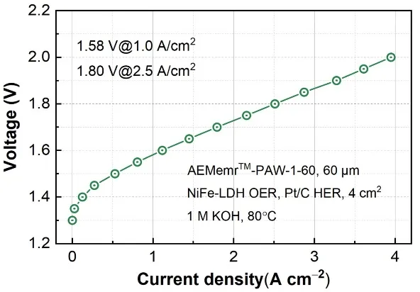 高强度的AEMemrTM-PAW-1-60可应用于阴离子交换膜水电解,60微米的厚度下可轻松应对粗糙金属扩散层。可匹配非贵金属催化剂 (1.8 V , 2.5 A/cm2 , 1 M KOH , 80°C) 制备出高纯度H2 ( >99.98%) ,并表现出突出的法拉第效率 ( >99.6%)。