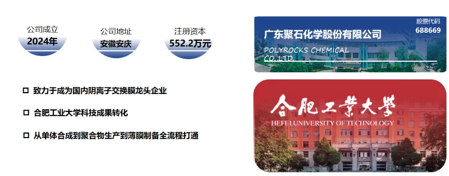安徽聚石氢友科技有限公司成立于2024年6月18日,位于安徽省安庆市高新区,主要产品为高性能阴离子交换膜,主要应用于水电解制氢、碱性膜燃料电池、液流电池、电化学合成氨等电化学能量转换装置以及水净化技术的高性能隔膜材料。