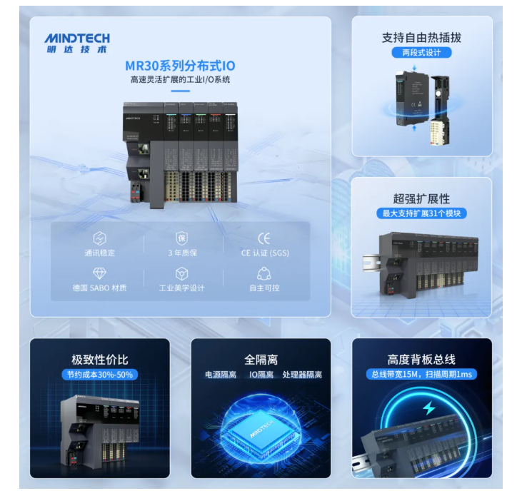 MR30系列分布式IO是一款适用于中大型设备及产线,离散型模块化、高度灵活的产品,核心元器件完全国产化,完全自主产权的产品,为工业控制提供质量可靠、供应稳定、性价比极高的解决方案。