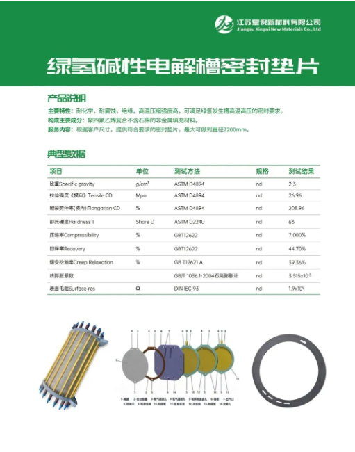 主要特性: 耐化学,耐腐蚀,绝缘,高温压缩强度高,可满足绿氢发生槽高温高压的密封要求。