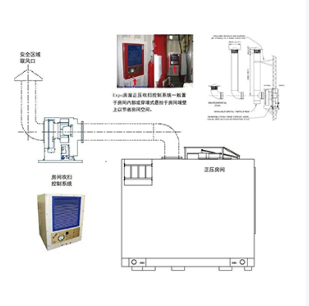 Expo房屋正压吹扫控制系统是一个E x p z型防爆装置,监控房屋和外界大气压力差符合规范要求。设置一个低流量的气流来维持房间内压力,确保危险气体无法进入需要控制的空间。气源可能来自远距离的安全区域,确保空气供应不含危险气体组分是用户的责任。正压房间及吹扫系统在化工等防爆环境中的仪表分析小屋、钻井平台司钻房、配电及电控房间等均可得到广泛应用。从安全区域提取洁净的自然空气, 通过吹扫控制系统对房间内通风, 确保房间内部始终处于非易燃空气正压保护状态, 实现房间内处于安全状态; 系统内置压力监控及报警操控相关装置。