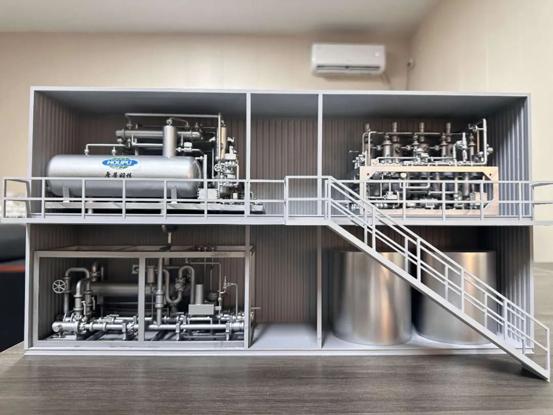 厚普氢能科技有限公司的集装箱式碱性电解水制氢设备,是一种高度集成化的制氢系统。该设备将电解槽、气液处理器、纯化设备、控制柜等核心部件集成于集装箱内,占地面积小,便于运输和安装。用户只需接入水和电即可快速制氢,氢气纯度可达99.999%,露点低至-70℃。其设计灵活,可适用于多种场景,如加氢站、分布式能源等,推动了氢能的广泛应用