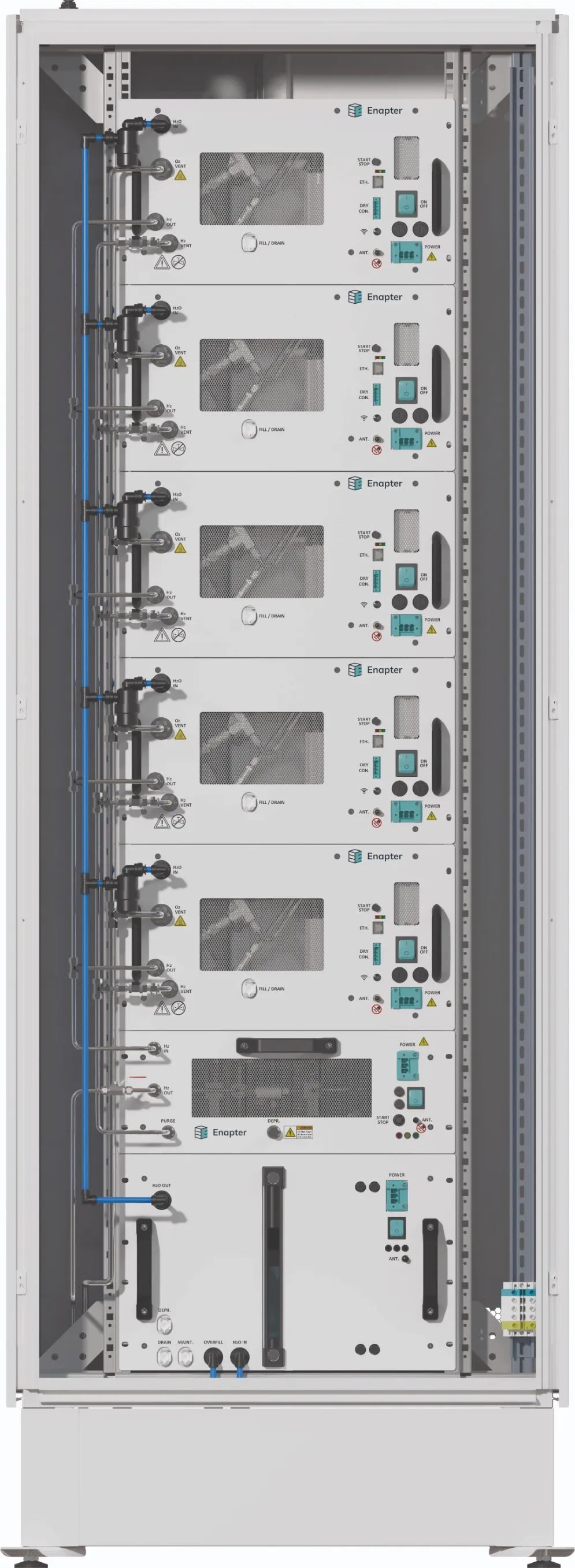 卧龙英耐德19寸柜机式水电解制氢装置,模块化的设计与高级软件集成相结合,可在数分钟内完成设置,并可进行远程控制和管理,通过多个电解槽堆叠可达到所需的氢气制备流量。
