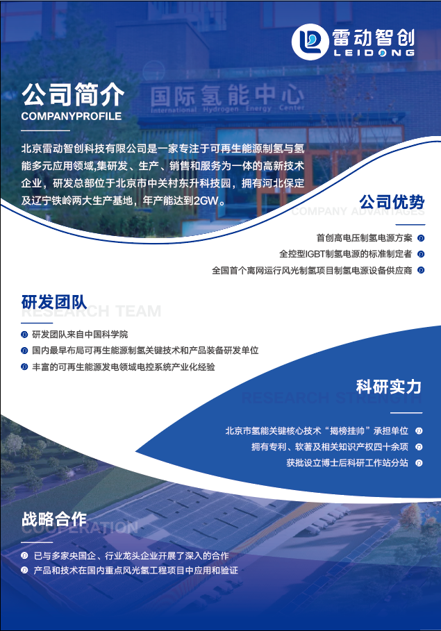 北京雷动智创科技有限公司是一家专注于可再生能源制氢与氢能多元应用领域的集研发、生产、销售和服务为一体的高新技术企业,研发总部位于北京市中关村东升科技园,拥有河北保定及辽宁铁岭两大生产基地。