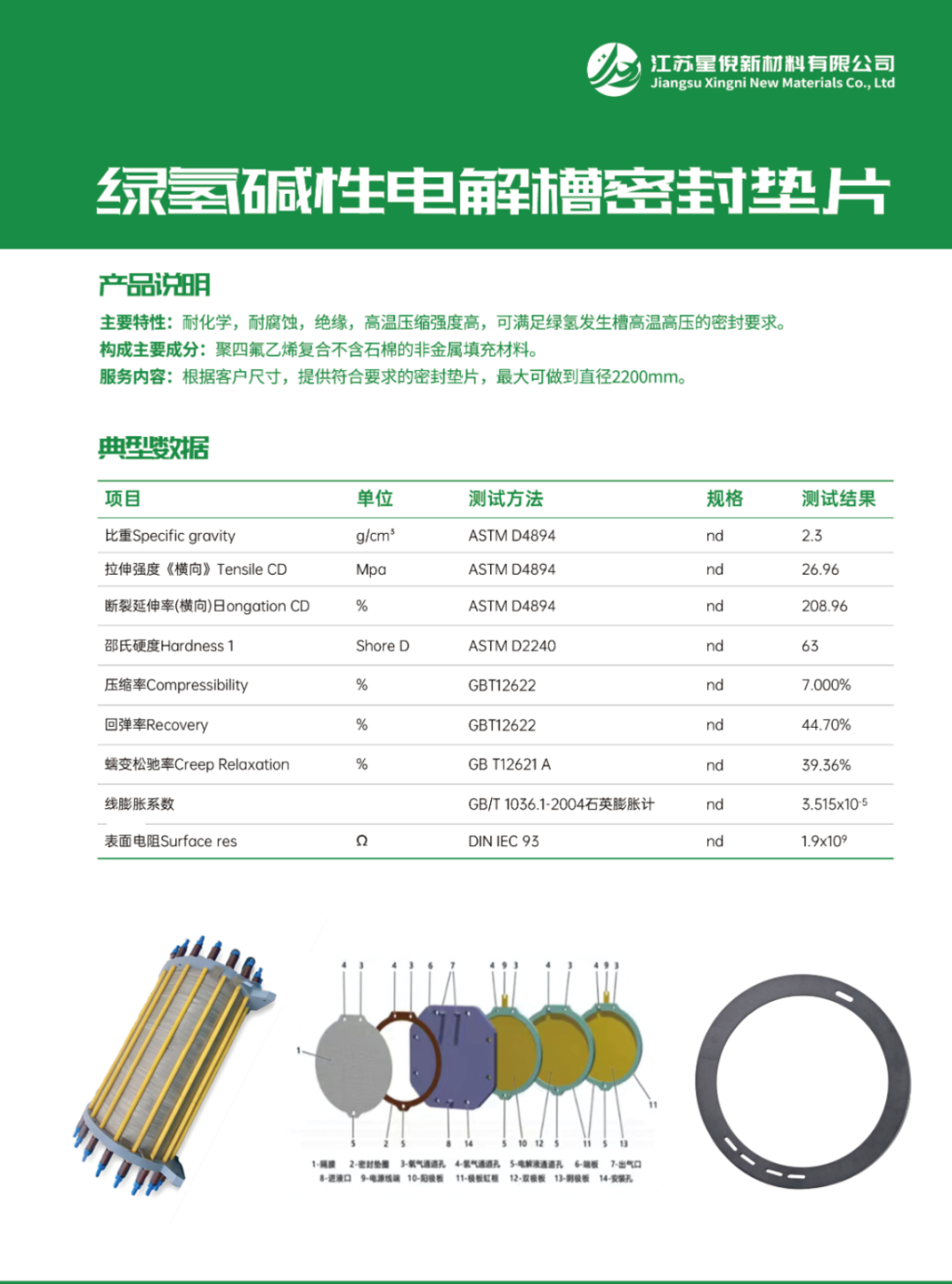 江苏星倪新材料有限公司为静密封垫片提供 Hyperflon®亥伯龙系列填充改性 PTFE 的混料、棒材、套筒及密封片成品。我司垫片的填充改性 PTFE 材料性能优异,不同配方体系可应用于绝大多数的耐酸碱腐蚀的化学流体、溶剂、以及液压油、润滑油,可长期发挥密封性能,可为氢能电解槽、石油化工、电子电器领域提供全工况的静态的垫片密封件的改性 PTFE 材料,使用温度范围可由冷媒至 260℃。