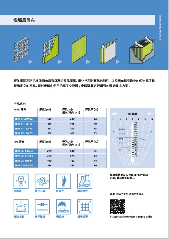 赛发集团定制的增强网布具有极高的开孔面积、耐化学和耐高温的特性,以及网布具有最小的织物厚度和精确定义的网孔,是对电解中使用的离子交换膜/电解隔膜进行增强的理想解决方案。